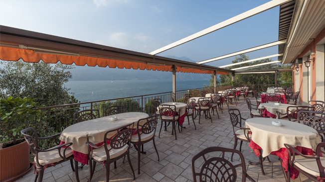 Sulla terrazza dell'hotel, con vista panoramica sul lago di Garda è possibile gustare alcuni primi piatti, insalate miste, panini, toast, pizzette, gelati, aperitivi, vini del territorio, bibite alcoliche e analcoliche (non inclusi nel prezzo della camera).